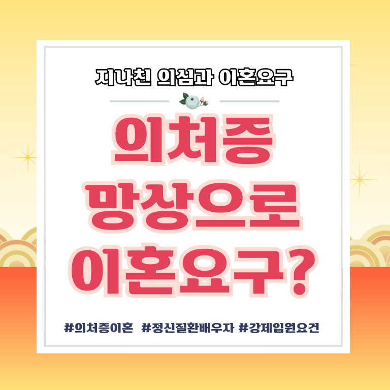 '아내가 바람났다!' 정신과 치료까지 거부한 배우자가 의처증과 지나친 망상으로 오히려 이혼요구까지 요구한다면 어떻게 해야 할까요 오늘은 배우자가 정신질환으로 인한 망상과 의처증으로 이혼을 요구하는 경우의 법적 대처 방법에 대해 알아보겠습니다. 이로 인해 별거까지 하게 되었다면 부양료 청구 방법과 강제 입원 요건까지 자세히 살펴보겠습니다.