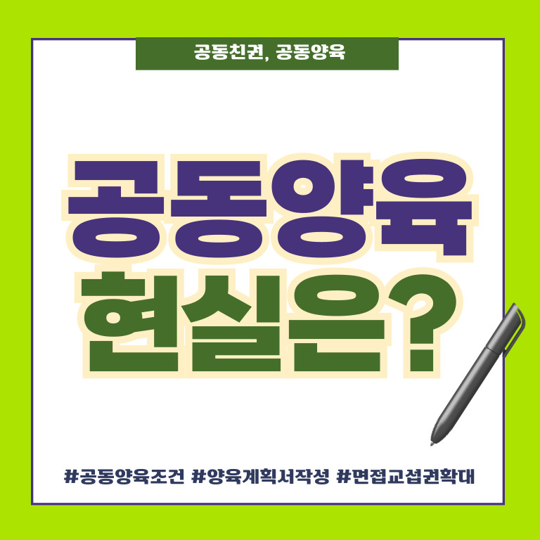 한국에서는 공동양육보다는 부모 중 한 사람이 아이의 친권자 및 양육자로 지정되고, 비양육자가 면접교섭을 하는 형태로 판결이 이루어지는 경우가 많답니다.