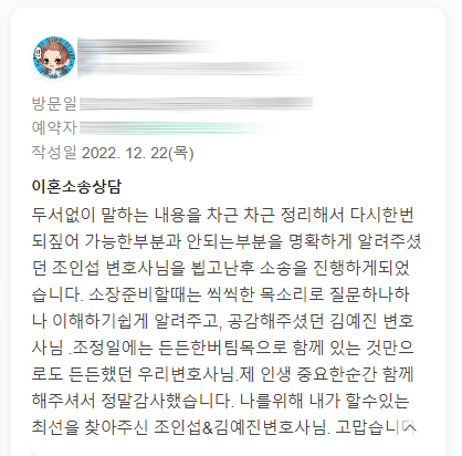 5년동안 이어진 배우자 외도로 이혼청구를 한 의뢰인의 감사인사 입니다
