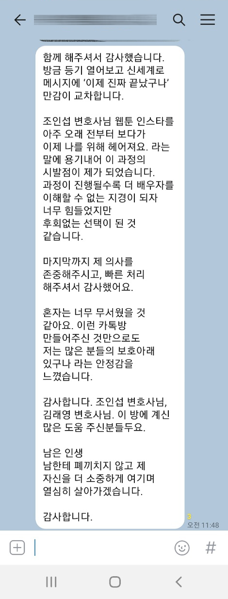 이혼조정신청 접수 2개월만에 이혼이 확정된 의뢰인께서 감사인사를 보내주셨습니다