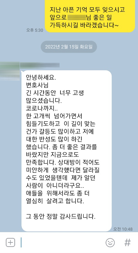 가정폭력으로 이혼청구하여 2년만에 승소한 의뢰인이 보내주신 메세지